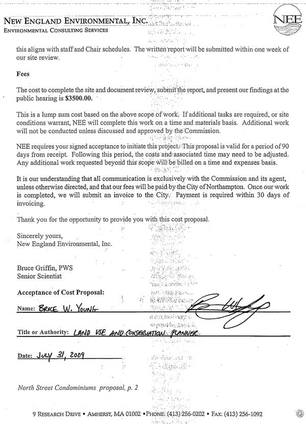 At their May 14 hearing, members of the Conservation Commission expressed a desire for an independent expert evaluation of how the proposed Kohl condo development off North Street (latest version) would impact the hydrology of the site. On July 8, the Commission issued the Request for Proposals shown below and has selected the proposal submitted by New England Environmental, also shown (or download it as a PDF). NEE’s report is scheduled to be discussed at a Conservation Commission hearing on Thursday, August 27, 6pm in the City Hall Hearing Room.